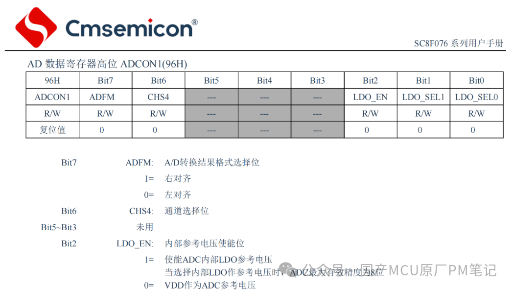 如下是中微SC8F076和芯圣HC18M30xF的用户手册,中微标注在选择内部参考电压时,有效位是8位;芯圣的典型值是10位。并非所有的用户手册都会标注有效位。