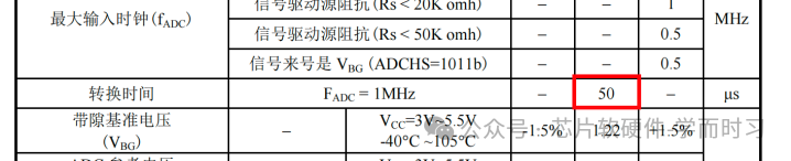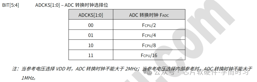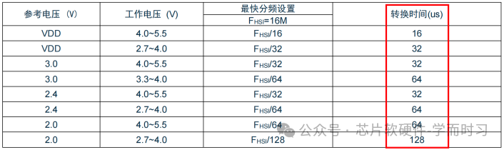 与之前厂商不同,晟矽将总时间明确划分为可配置的采样时间与固定的12个AD时钟转换时间。因此,总时间 = (采样时间 + 12) / AD时钟频率。