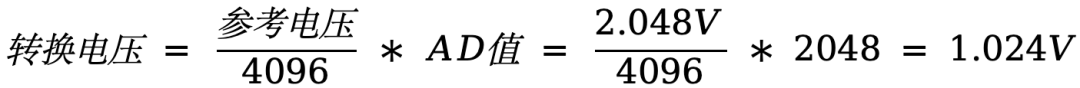 举例来说,在12位ADC中,若参考电压为2.048V,采集到的AD值为2048,则实际电压为: