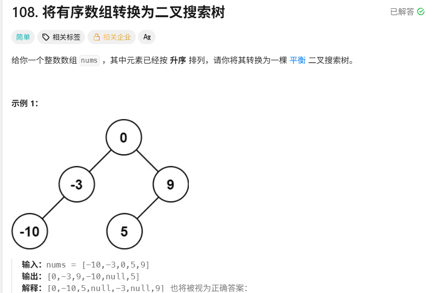 心得:题目要求就是将数组转化为构建一颗平衡树,所以很容易想到使用折半的方法,每次使用mid作为根节点进行递归,但需要注意递归的结束条件设定以及创建根节点等细节处理。