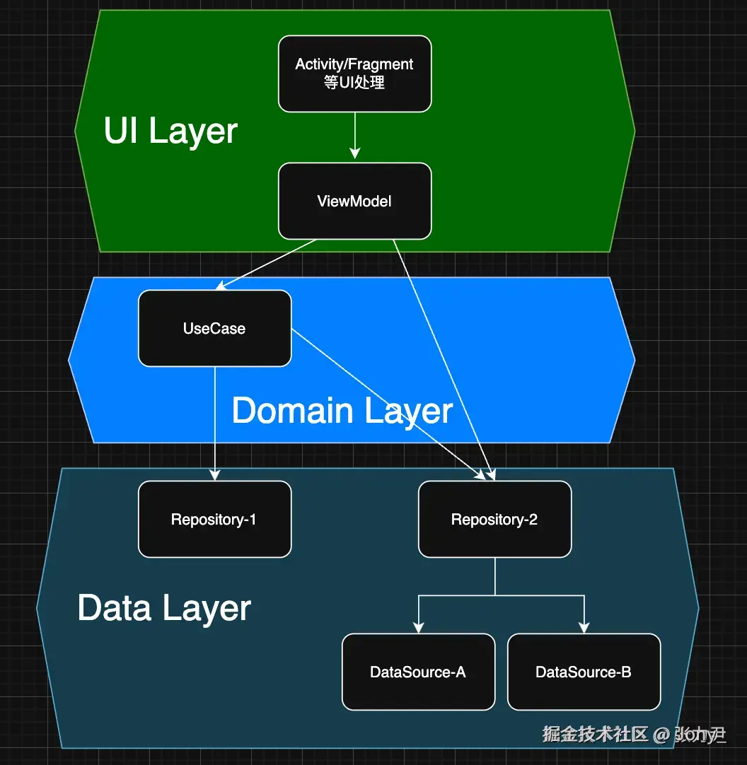 - I:指Intent,View 通过 Intent 和 ViewModel 交互,ViewModel 持有 Domain Layer(非必须),后者持有 Data Layer(Model 层)