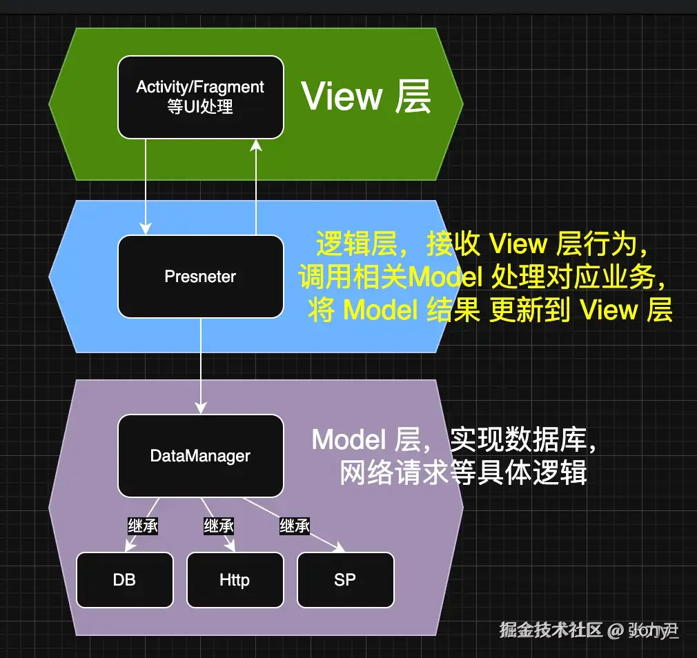 和 MVC 的区别是,这里的业务逻辑不再写在Activity/Fragment中,另外 View 层所依赖的不再是某个具体的 Presenter 实例,而是 Presenter 抽象接口。