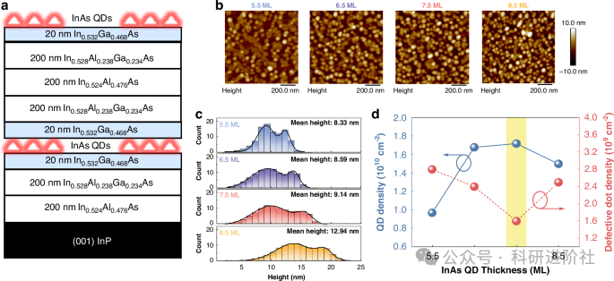 图1:不同InAs厚度的单层InAs/InP量子点的外延结构与形貌表征
