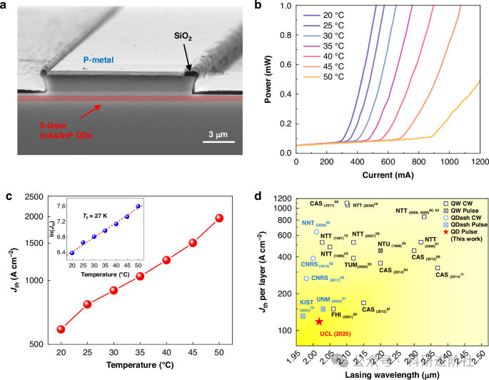 阈值电流密度(Jth)低至589Acm⁻²,每层仅118Acm⁻²,是目前所有室温工作的InP基中红外激光器中的最低值。