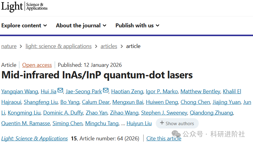 这是中红外激光技术的一个重要里程碑。近日,伦敦大学学院、格拉斯哥大学、兰卡斯特大学等英国多所高校联合团队在《Light: Science & Applications》期刊发表突破性研究,首次实现了基于InAs/InP量子点的中红外激光器(https://doi.org/10.1038/s41377-025-02167-4)。