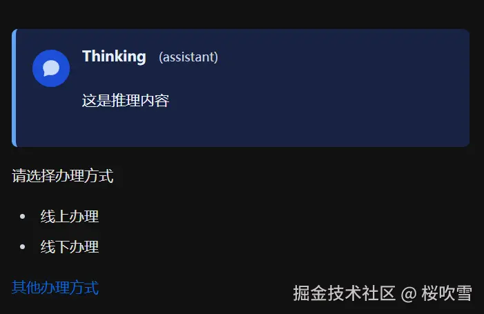这里实现的一个项目是ai对话的应用,特点是可能markdown里要混着各种业务组件,以及一些md的节点可以点击交互,比如列表项或者链接点击代替用户自动发送信息。