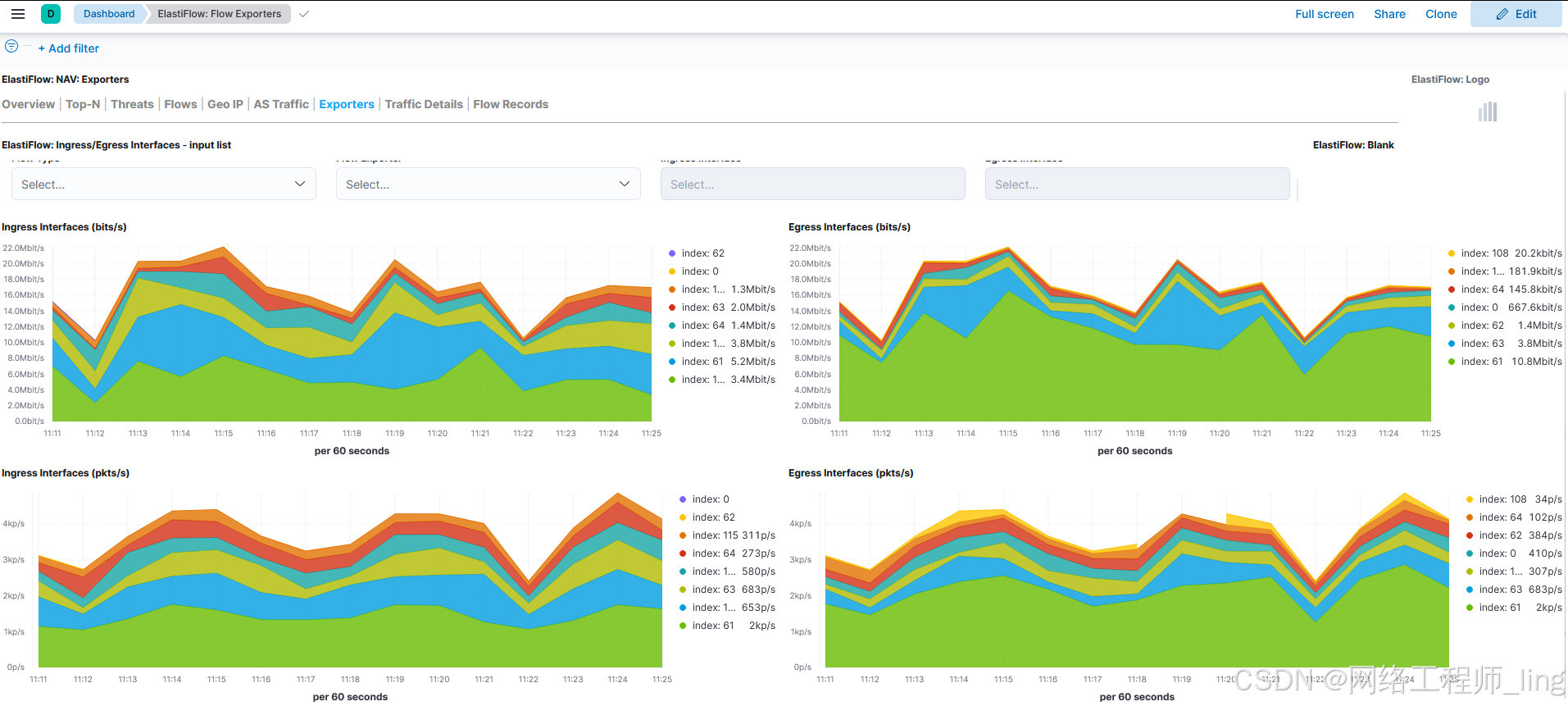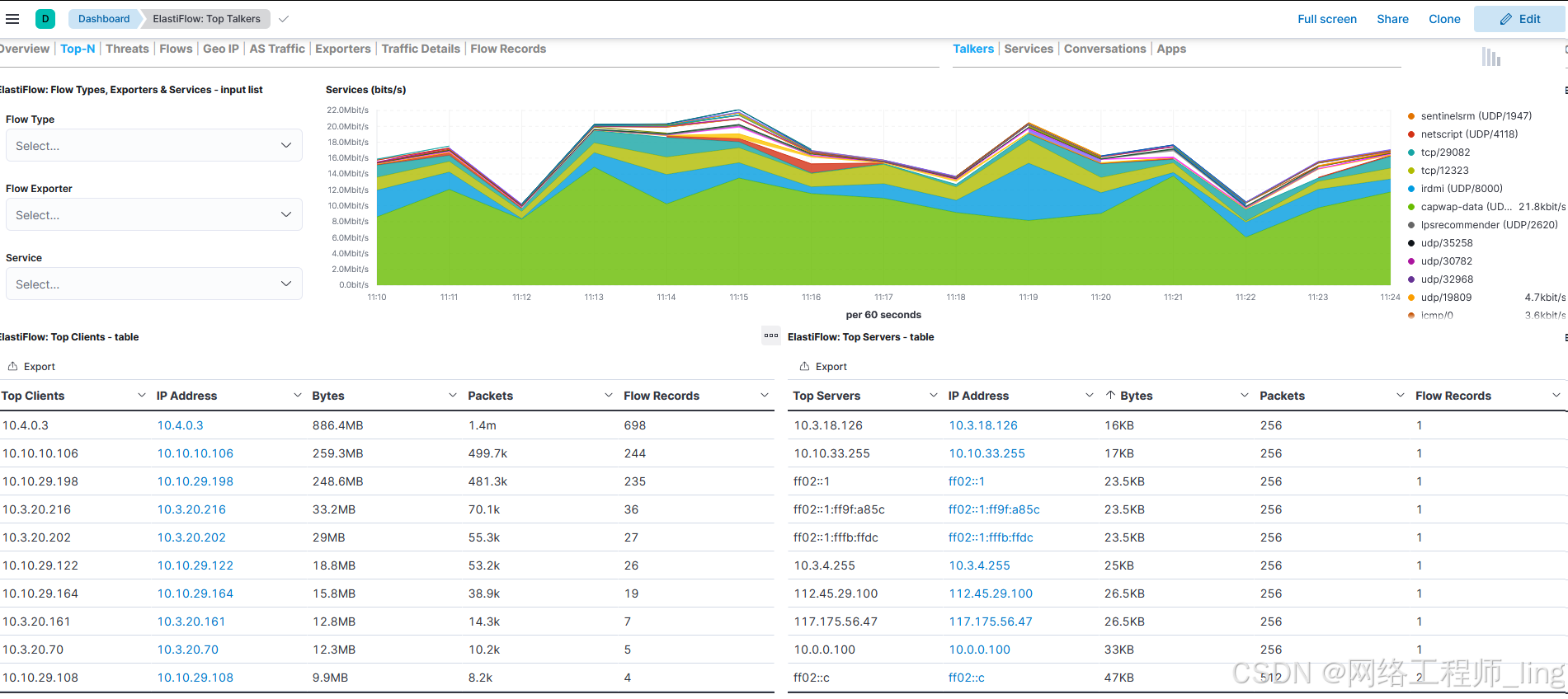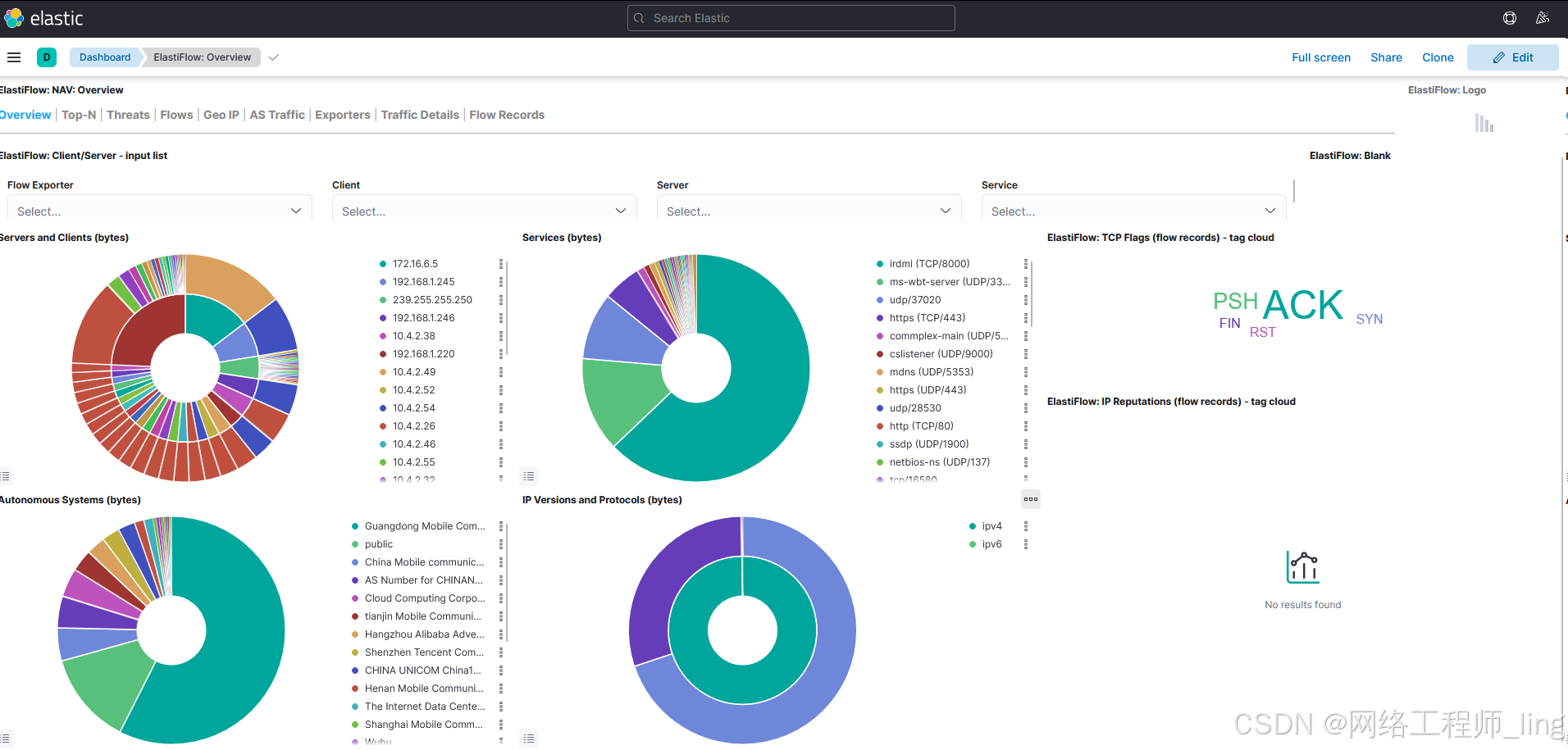 功能:实时采集华为交换机流量、ES 持久化存储、Kibana 可视化展示(流量 TOP IP / 协议占比 / 接口流量等)