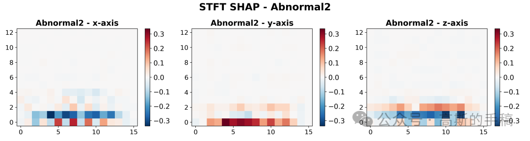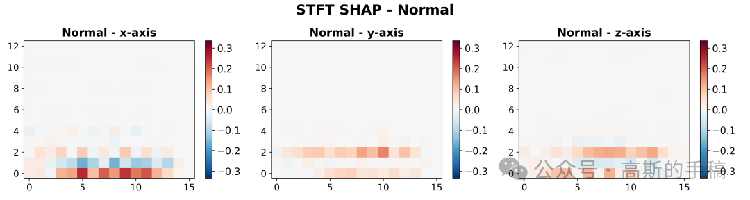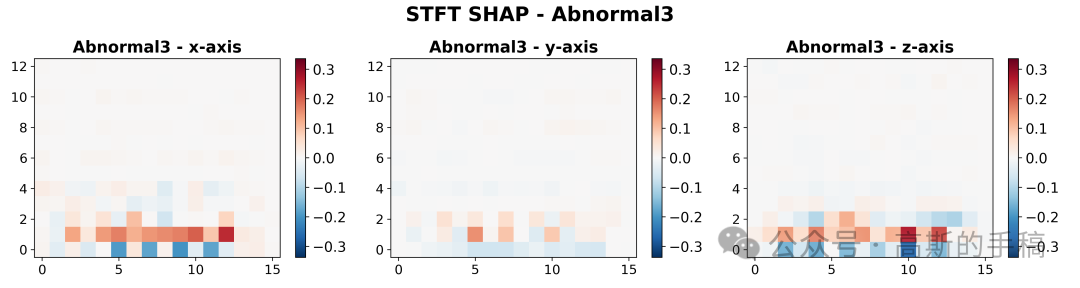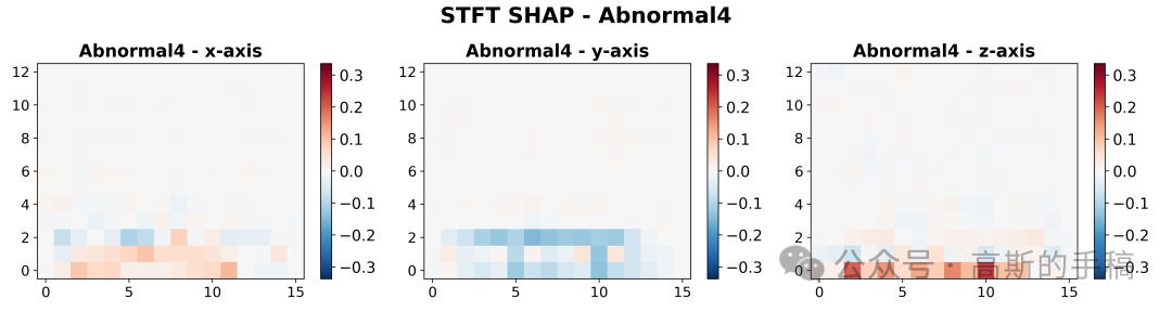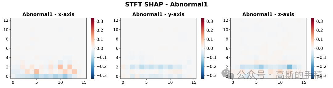 第四步,频域特征重要性可视化:加载短时傅里叶变换(STFT)后的SHAP重要性值,计算所有类别和通道的全局最小最大值用于统一颜色映射,为每个振动类别创建包含三个通道(X、Y、Z轴)的STFT SHAP热力图,使用红蓝对比色系展示频域特征对模型决策的正负向贡献。