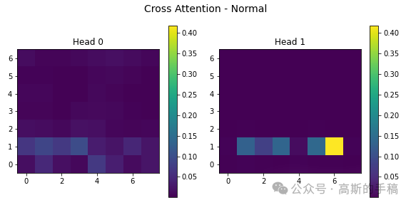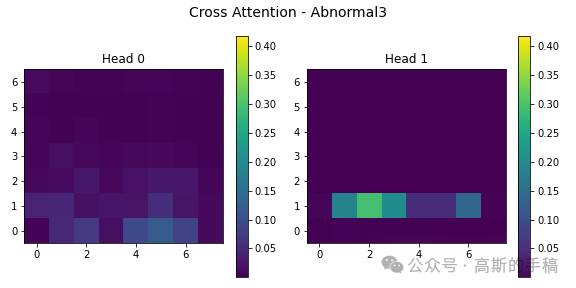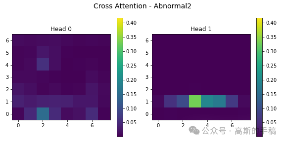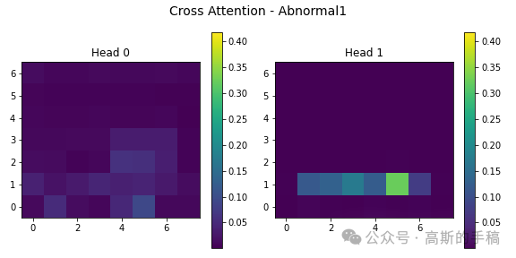 第五步,注意力机制可视化:提取多模态模型中的交叉注意力图,展示不同注意力头在处理查询-键关系时的关注模式,使用绿色渐变色系(viridis)统一显示所有类别和注意力头的激活强度,揭示模型内部信息交互的重点区域。