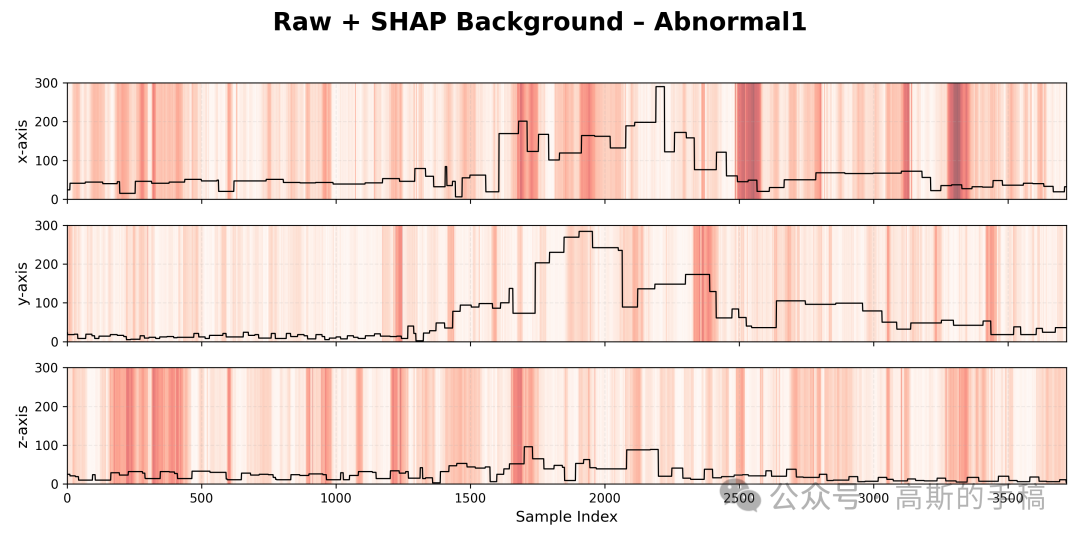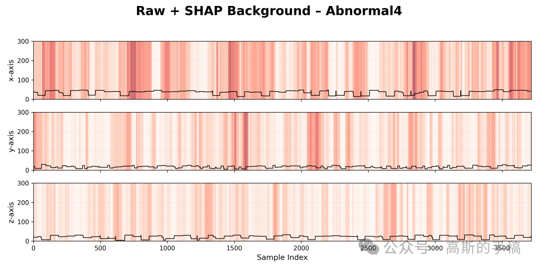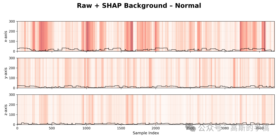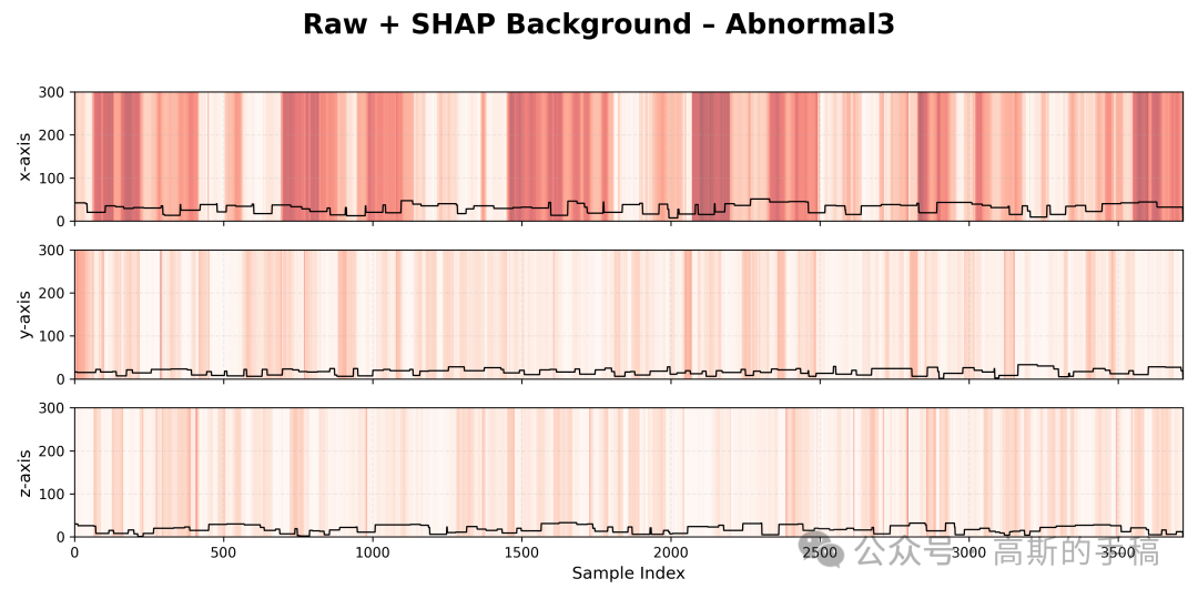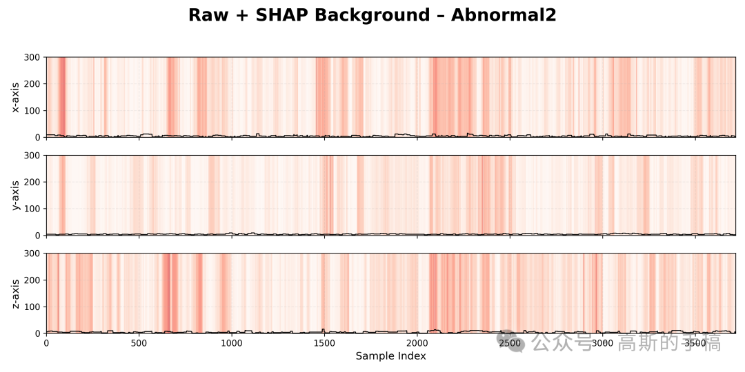 第三步,时域信号与SHAP重要性叠加可视化:对每个振动类别和每个传感器通道,计算SHAP值的全局归一化范围,将SHAP重要性映射为0到1的归一化值,使用红色渐变色系将归一化后的SHAP值作为半透明背景,与黑色的原始时域振动波形进行叠加显示,形成重要性热力图与原始信号的双重视觉层。