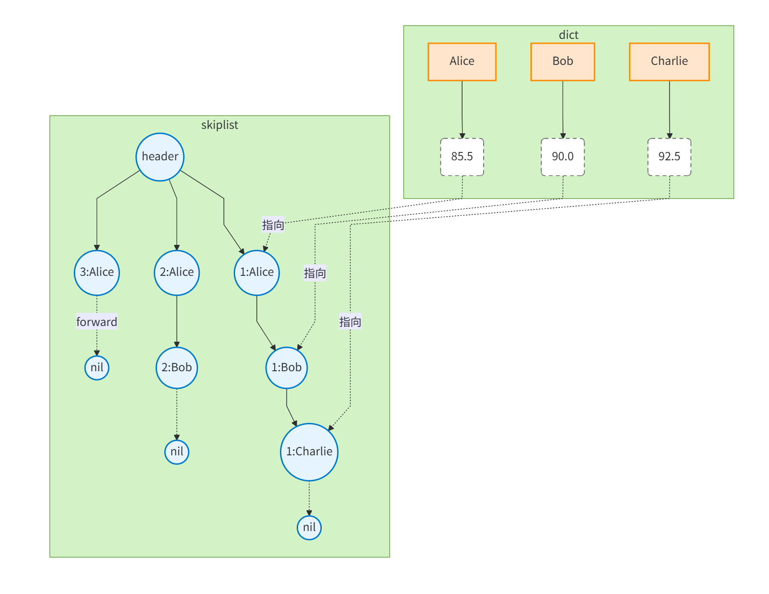 ZSet同时使用跳表(skiplist)和字典(dict)来保证: