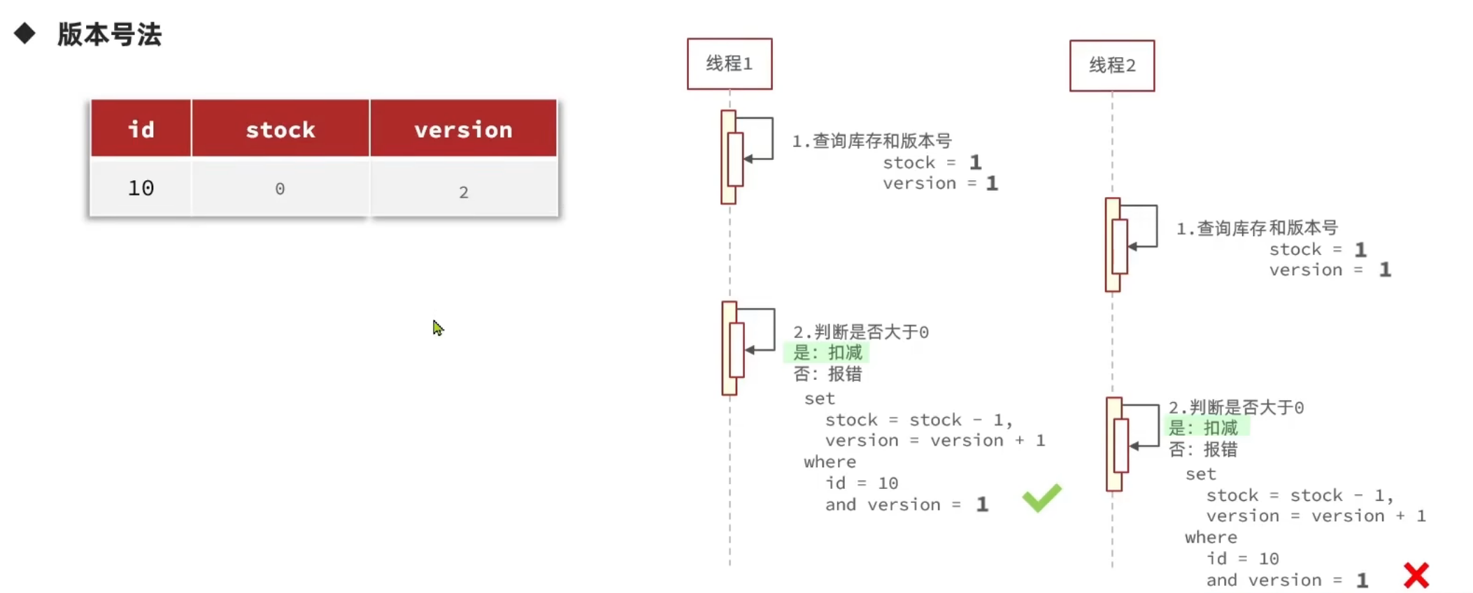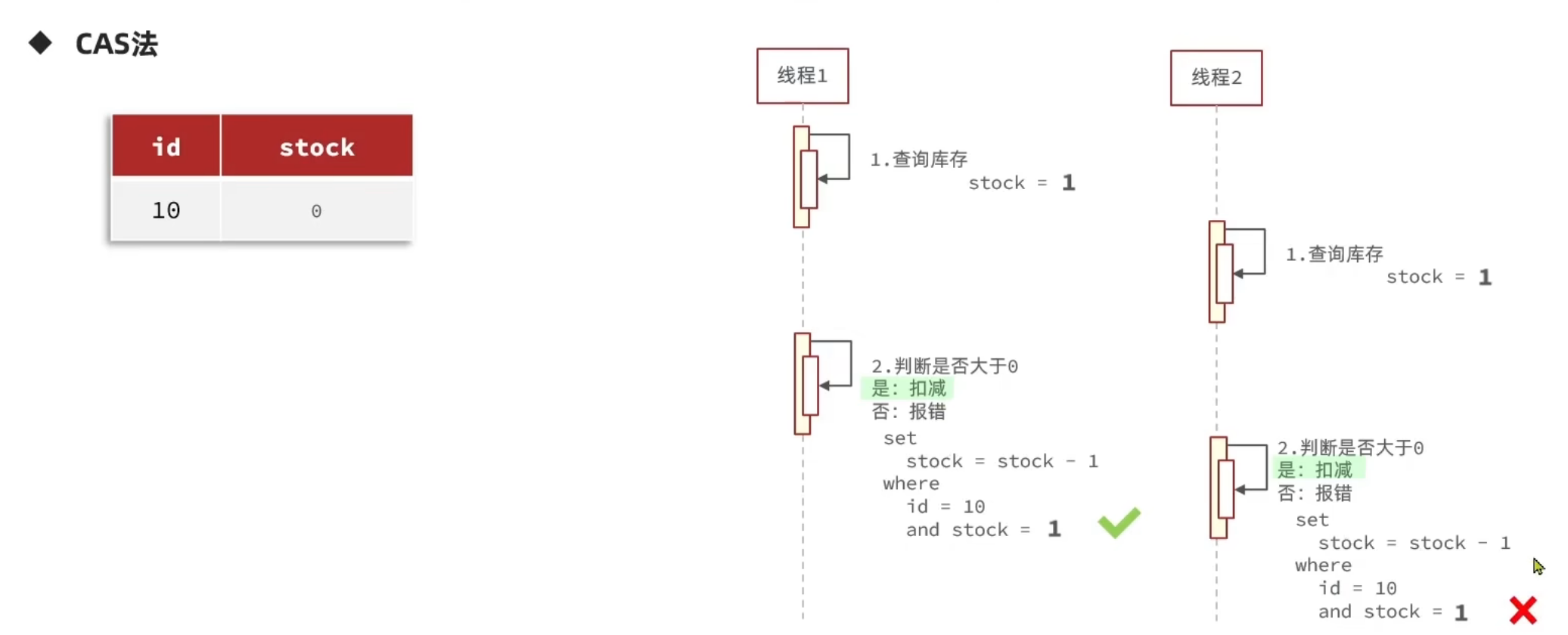 | CAS(stock > 0) | 实现简单,性能高,秒杀场景首选 |