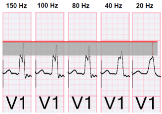 QRS波群中那些幅度最大的成分在经过滤波处理后其幅度会明显减弱,因为波形中这些幅度最大的成分所包含的频率最高。无论滤波设置如何,QRS波群的形状和持续时间都表明患者存在右束支传导阻滞,但如果比较这些QRS波群,容易得出结论"患者病情发生变化",而这是由于滤波处理所导致的。