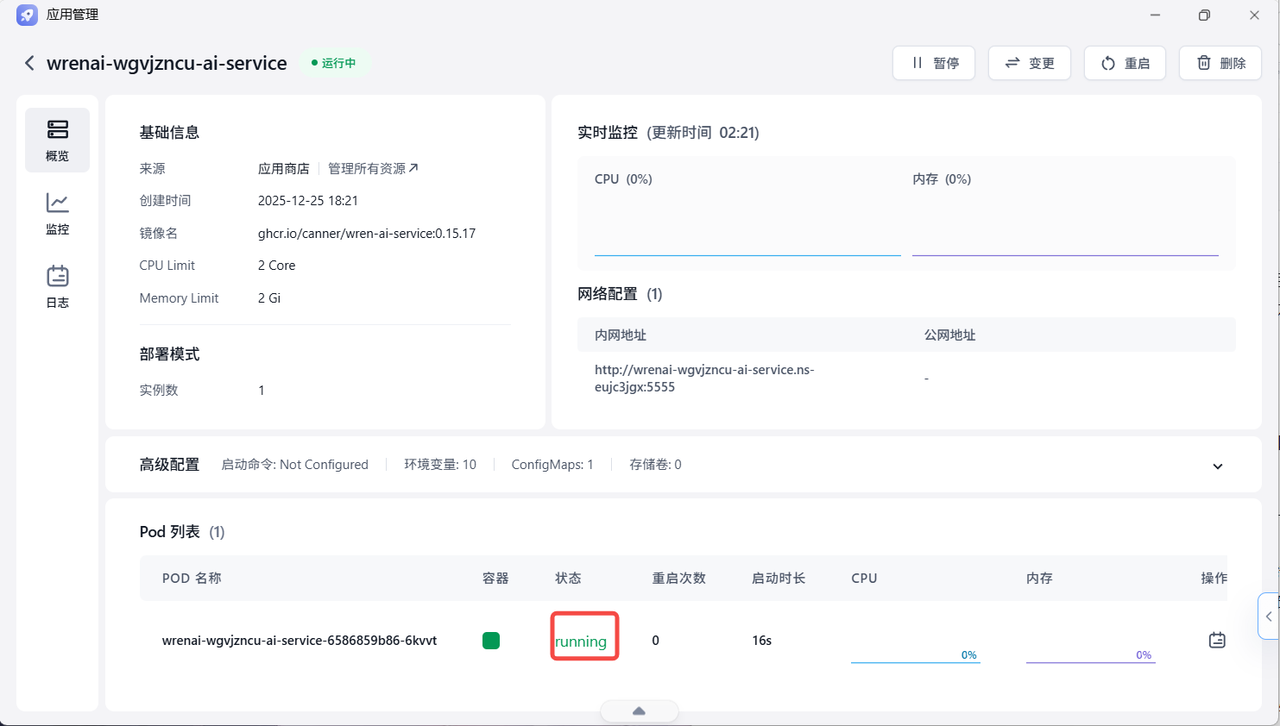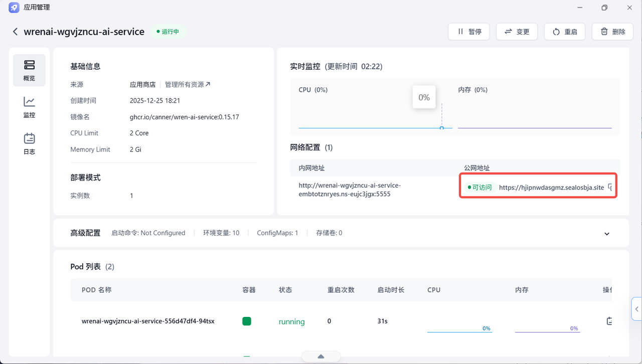Sealos 的自动化流程开始启动,它在后台完成了所有环境配置、依赖安装和服务整合。大约 3 分钟后 ,应用状态变为绿色的 Running 。我的私人 AI 数据分析师正式上岗!