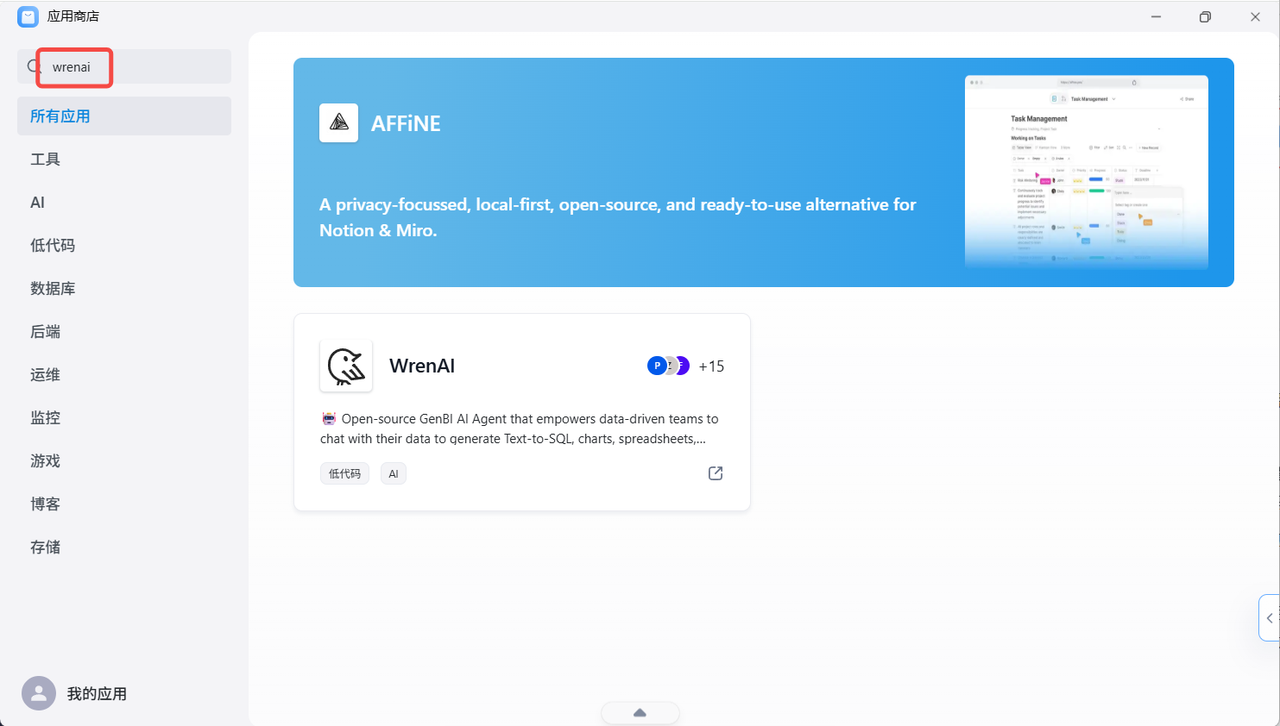 在搜索框输入 wrenai,找到了这个强大的 AI 工具。