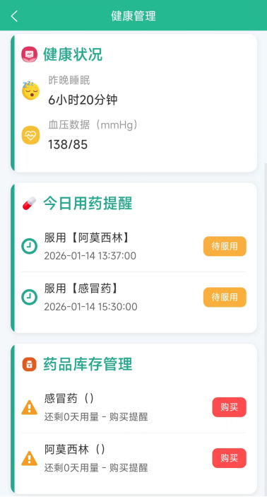 2、聚焦用药管理痛点,提供精准定时用药提醒服务,明确药品名称、服用剂量及时间节点,内置药品库存监测功能,余量不足时自动触发购买提醒,从根源上避免漏服、断药问题。