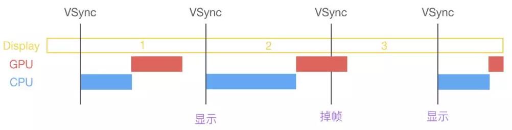 搞清楚了 iPhone 的屏幕显示原理后,下面来看看在 iPhone 上为什么会出现卡顿现象,上文已经提及在图像真正在屏幕显示之前,CPU 和 GPU 需要完成自身的任务,而如果他们完成的时间错过了下一次 V-Sync 的到来(通常是1000/60=16.67ms),这样就会出现显示屏还是之前帧的内容,这就是界面卡顿的原因。不难发现,无论是 CPU 还是 GPU 引起错过 V-Sync 信号,都会造成界面卡顿。