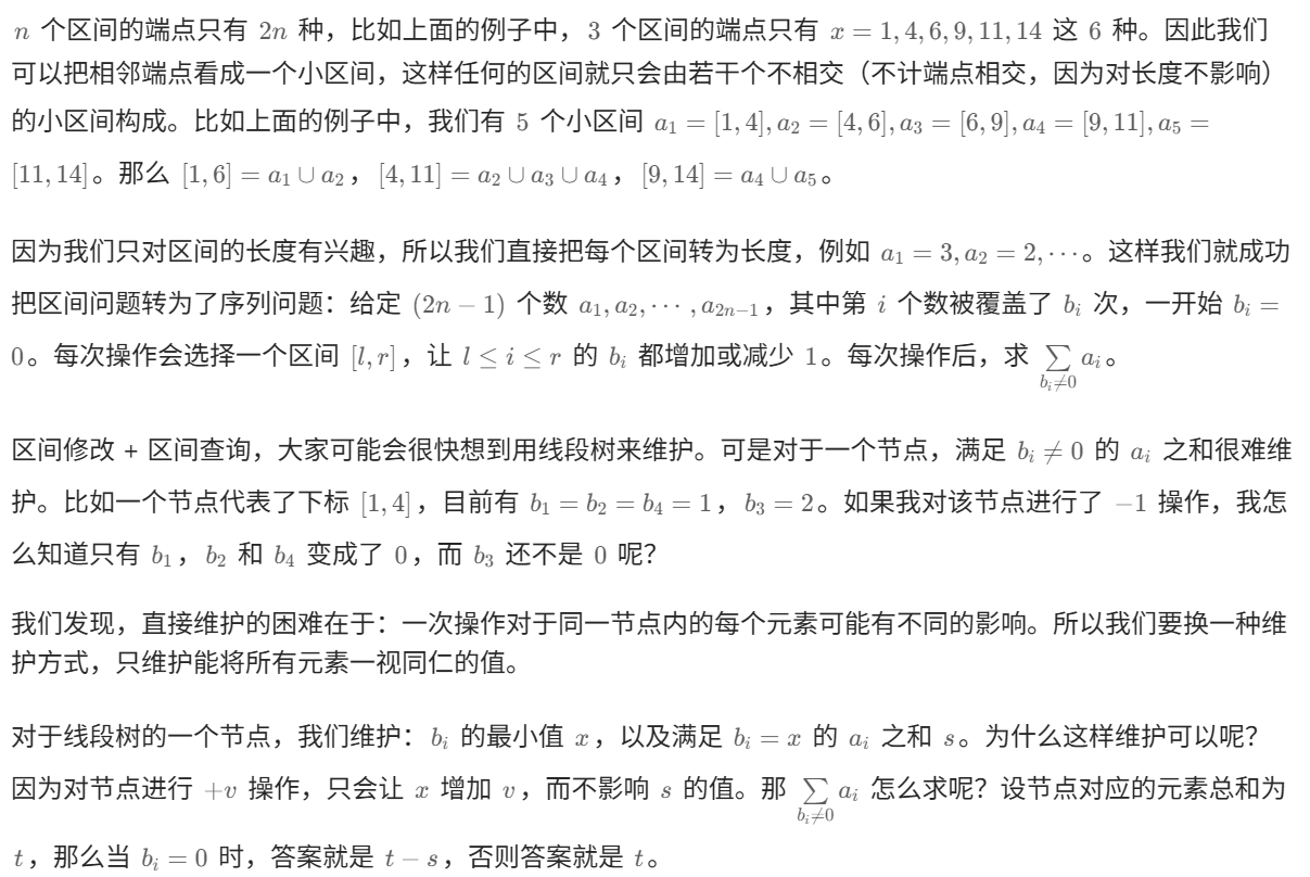 从上面的例子可以看出,横截长度的变化,其实就是维护一个区间的集合。每次我要加入或删除一个区间,然后求区间并集的长度。