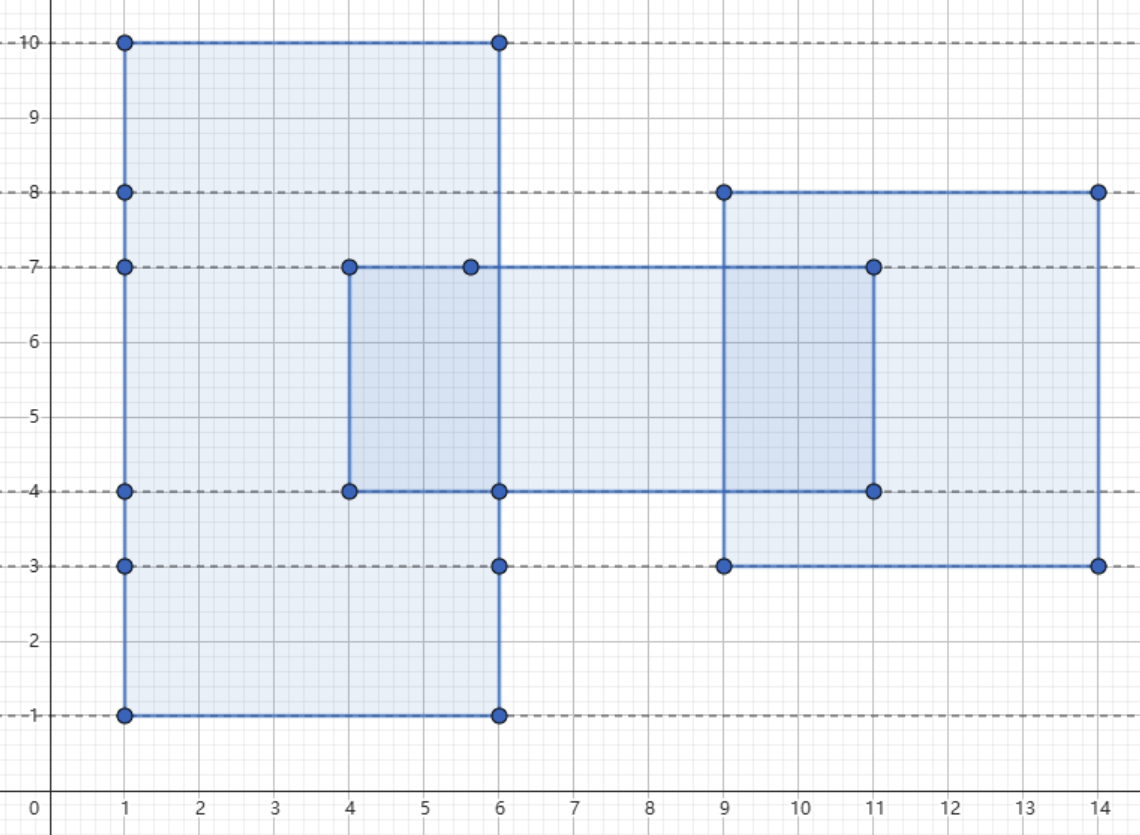 - 到了 y=8 时,由于一个矩形的退出,区间的数量又减少了一个,变成 [1,6] 的长度,即 5。所以 y=8 到 y=10 之间的面积是 (10−8)×5=10。