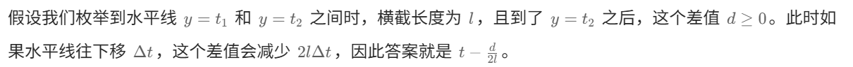 因为操作涉及到了区间修改 + 区间查询,我们可以用懒标记下推线段树完成操作的维护。这样我们就成功维护了横截长度。最后的问题是找到最下面的水平线,使得水平线下方的面积并减去水平线上方的面积并大等于 0。