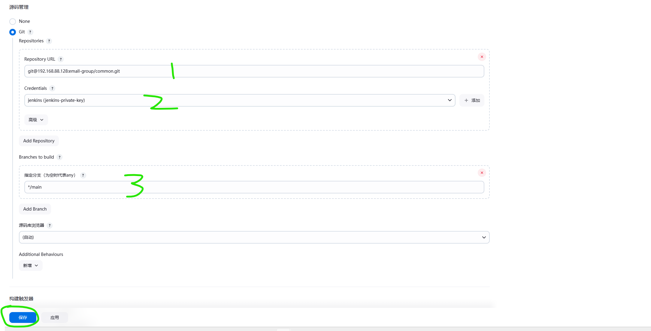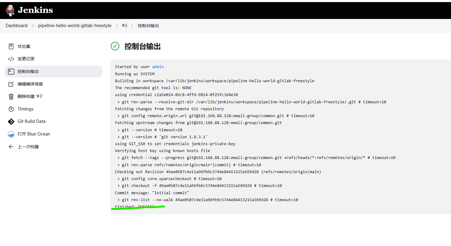 root@hadoop .ssh\]# sudo groupadd jenkins \[root@hadoop .ssh\]# sudo useradd -r -m -d /var/lib/jenkins -s /bin/bash -g jenkins jenkins \[root@hadoop .ssh\]# sudo passwd jenkins Wang#1234 密码复杂度要符合要求 \[root@hadoop .ssh\]# su jenkins 切换用户 \[jenkins@hadoop home\]$ sudo -u jenkins ssh-keygen -t rsa -b 4096 -f /var/lib/jenkins/.ssh/id_rsa -N "" 重新生成公钥私钥 Generating public/private rsa key pair. Your identification has been saved in /var/lib/jenkins/.ssh/id_rsa. Your public key has been saved in /var/lib/jenkins/.ssh/id_rsa.pub. The key fingerprint is: SHA256:XcAQa/v9xTj0KVNbOGecjXB2yEgX5Ol5eCigKgihRAg jenkins@hadoop The key's randomart image is: +---\[RSA 4096\]----+ \|E. o+. ..+. \| \|o ..o = o \| \|.. o . + B .\| \|o. . + o = Oo\| \|o S . . XoO\| \| . . . . . o.X+\| \| . . . . .ooo+\| \| . .oo \| \| . \| +----\[SHA256\]-----+ \[jenkins@hadoop home\]$ cd /var/lib/jenkins/.ssh/ \[jenkins@hadoop .ssh\]$ ll 总用量 12 -rw------- 1 jenkins jenkins 3243 1月 14 02:23 id_rsa -rw-r--r-- 1 jenkins jenkins 740 1月 14 02:23 id_rsa.pub -rw------- 1 jenkins jenkins 668 1月 13 15:56 known_hosts **cat id_rsa 查看私钥,将私钥拷贝黏贴到 下图所示的private key 中** **-----BEGIN RSA PRIVATE KEY----- MIIJJwIBAAKCAgEAkmDQW/NFCHen7d/VmpbyAEvelRj7QmB7wpzmeu+3BKhw67PI V2Yta6cgw469nyJAHcMDRQ9h0BwxLBVff0hrAE/XtbWBkWH247pVN6TlSKlPRwII GUyd/GvdOsbQ+hfJMbdm3ccC6/1D+jhMcetNZ1BWWPrzZ0ncT/YskUvZ48rWbT3N ziG0EwA0ZLjLI4WfYP4i6MBuqyVPCC3wuDX3W3pteF9Q9ywyyPcrnlNtXm8+54wO RzP8xDiDuhvsH9A+fVCAHRCb/Pafxz6c4h/z5OcOnVsMOoJ1puWm2+aLz6lbGq8T wRxKllg1UEOOumHwdij7V5zrV3dA5qeffurL96YgbsbirccVrbAQG2ohWOLXG+/B lCosBzrqr9OTA08P46yTHJ4W219KzjrbD5IBqP8Fo4rL6d/UTh0RSYvvW2qpYjei 4PmOC1IfhrMnUWtfqoxLBa9SYZwgc3/YQ28fm8tBntgHnltuh++D3hP8jVeY9G/X bjNfy1yoJcQ+NwKCAQEAwPVtiAFgNvFF24+lMS2eejHQFp/lvbBJhLS8y0RjuYBA cfQ+jHd9ttlZOCDH5cDehpVcfvQikzX7Axaa+WiAbAtXP79ceLZX1ILxEpxBU7+p kkaEOq/OG8vARSFZPnVVmt4BqagB8t01Afl31HnqFrbO7ltoVvRmedF/JDgTOLAf B8zdobz2uAQQWh1XMrPgdmQSiZr7VEU0RpGwrRaH3eR9u4CFoYfCES5q9OOgg0iG pGytoj+NuoYd2p94sCdkSGfCNCNv9BrXK7NcLVSSDzDIcSUUVFbbuIts9EOBdKOU CkeeAkvYp6gvOBGFehlAIl1/C6kYThSySbSgWhQpDQKCAQBmgEeffv13+YohOx8Z jZkF5P4FoNWYPKendSBHbSRcWnXn3GbWg1GJBrFui3343fMWDHTZ3iDhYygz7Vxh Qxu3qdUhKmM/4OErQ7NzkYeIL8SDVGIgS9WoqsrBKg4QDQzWhwwMd3tAKmu7Ja2I HkQmLcXNiTRDN7ZUuIa4nBsuXSoUXRUabgpT5hc7JyYwqzAz7dgY4O00g82rYgdg CYbVERb+MY7X5eIg7opLBch/NT6AYXsnjKJvkg2Zq8DTLGmdHWWwnmrUFbQVIXv4 UXQKPxh20VkuF9JfaTt//i0XY5s7OG+fPMasTGR4rTehLWbyMt18j72bTQ== -----END RSA PRIVATE KEY-----** **id 是自动生成的不用填** **描述:起一个自己能识别的名字** **username 是jenkins 所在服务器上,创建的jenkins用户**  **cat id_rsa.pub 查看公钥** 将公钥拷贝到gitlab 对应项目下的SSH key 配置项中 ssh-rsa AAAAB3NzaC1yc2EAAAADAQABAAACAQCSYNBb80UId6ft39WalvIAS96VGPtCYHvCnOZ677cEqHDrs8hXZi1rpyDDjr2fIkAdwwNFD2HQHDEsFV9/SGsAT9e1tYGRYfbjulU3pOVIqU9HAggZTJ38a906xtD6F8kxt2bdxwLr/UP6OExx601nUFZY+vNnSdxP9iyRS9njytZtPc3OIbQTADRkuMsjhZ9g/iLowG6rJU8ILfC4Nfdbem14X1D3LDLI9yueU21ebz7njA4jXhaZ2I3xKNg0Gye2xGl6+SbA2S8wxqZHB6Z3ogq8BpOgnWOwC9kkFrO8WenoLTGNWM7mG0514Qp2f3xTL23EI/2ZKvra+Q2qAHsh+9izmgmB3gNRUnBgfBSwx9rB3DxDfsT+3PDMtV5pNPffm2IKtf3RMYpOlnRD11dOsBrO605MOI2qTgQBSCEl9x3iRRw0+odagQO8ux5NbqSIqizn3yw== jenkins@hadoop  \[jenkins@hadoop .ssh\]$ systemctl start jenkins \[jenkins@hadoop .ssh\]$ ps -ef \| grep genkins jenkins 63308 60452 0 02:29 pts/0 00:00:00 grep --color=auto genkins \[jenkins@hadoop .ssh\]$ ps -ef \| grep jenkins root 60451 49834 0 02:21 pts/0 00:00:00 su jenkins jenkins 60452 60451 0 02:21 pts/0 00:00:00 bash jenkins 63197 1 73 02:29 ? 00:00:39 /usr/local/jdk-17/bin/java -jar /usr/share/jenkins/jenkins.war --httpPort=8080 jenkins 63606 60452 0 02:30 pts/0 00:00:00 ps -ef jenkins 63607 60452 0 02:30 pts/0 00:00:00 grep --color=auto jenkins 说明启动成功 192.168.88.128 是gitlab 所在的机器 \[jenkins@hadoop .ssh\]$ git ls-remote -h git@192.168.88.128:emall-group/common.git HEAD 检查是否连接到gitlab 并且能访问分支 创建一个自由风格的jenkins任务  添加git 路径和私钥,并选择需要拉取的分支,保存  点击构建  查看控制台输出,最后显示success ,并且日志重打印出拉去的分支,说明jenkins + gitlab 自由风格的任务创建并执行成功,拉取到了对应的代码 ``` Verifying host key using known hosts file > git fetch --tags --progress git@192.168.88.128:emall-group/common.git +refs/heads/*:refs/remotes/origin/* # timeout=10 > git rev-parse refs/remotes/origin/main^{commit} # timeout=10 Checking out Revision 49ae0507c4e11a96fb9c5744e84413215a569d28 (refs/remotes/origin/main) ```