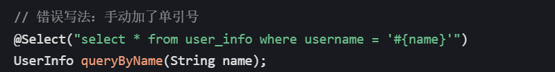传入zhangsan时,#{name}先自动加单引号 变成'zhangsan',再拼接手动引号,最终 SQL: