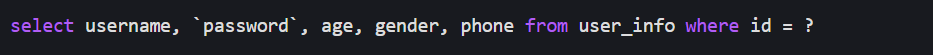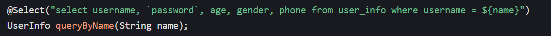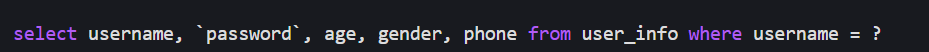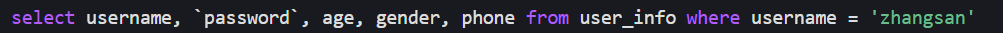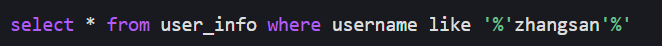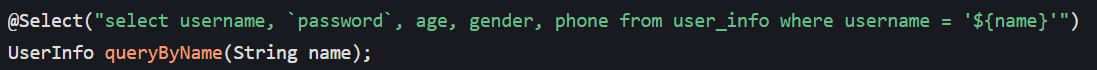 语法合法,但仍存在 SQL 注入风险 (比如参数传入zhangsan' or '1'='1,会拼接出username = 'zhangsan' or '1'='1'****,查询全表)。