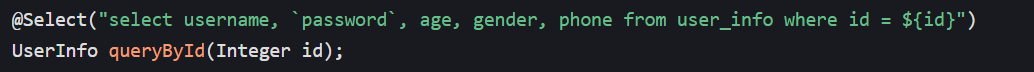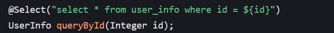 执行逻辑: MyBatis 将#{id}替换为?占位符,生成预编译 SQL