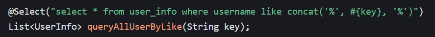 利用 MySQL 的concat()函数拼接模糊查询的通配符 ,同时保留#{}的安全性:代码(正确示例):