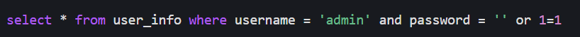 恶意参数:密码传入"' or 1=1'",拼接后 SQL 为: