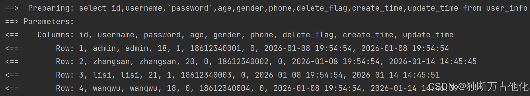 select id,username,`password`,age,gender,phone,delete_flag,