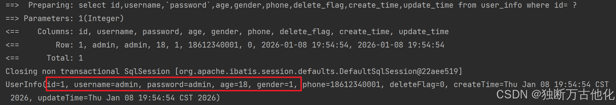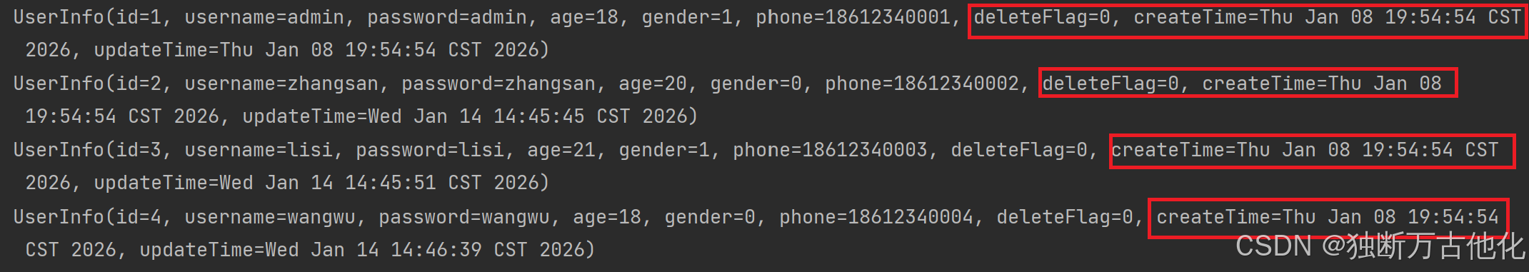 从运行结果上可以看到,我们SQL语句中,查询了delete_flag, create_time, update_time,但是这几个属性却没有赋值。