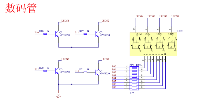- 将数码管对应的NPN三极管的基级(P10-P13)给定高电平,就可以去选中某一位数码管