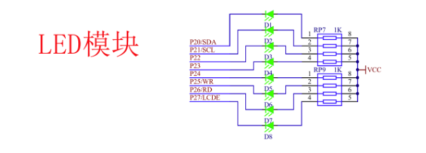 将所有发光二极管的阳极连接到VCC,发光二级的阴极接到单片机的引脚,此时阳极输出高电平,给对应单片机引脚低电平,满足发光二极管的单向导通性,电流会从阳极流向阴极,LED被点亮