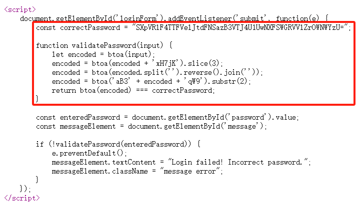 发现正确密码已经在js文件中暴露,用base64解码得到正确的登录密码