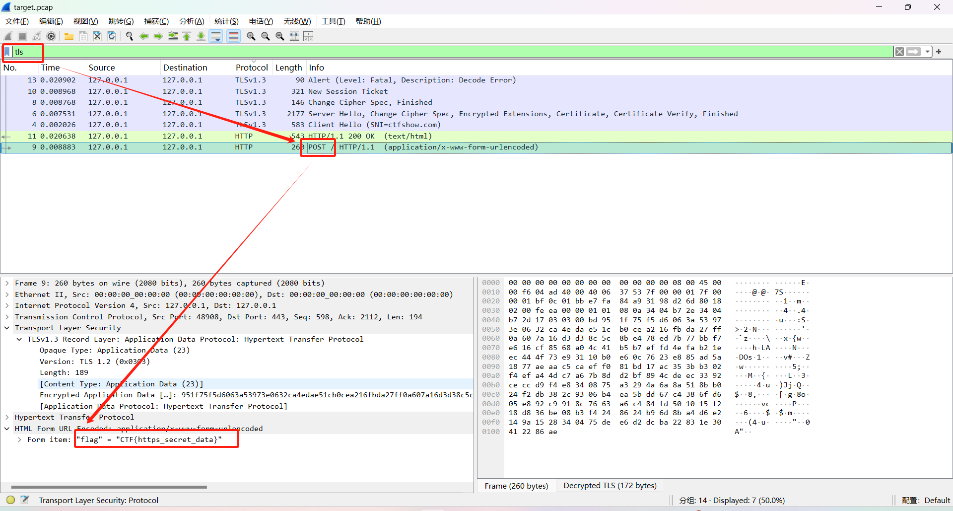 直接用wireshark打开这个流量包,协议过滤器输入TLS,找包含POST方法的请求包
