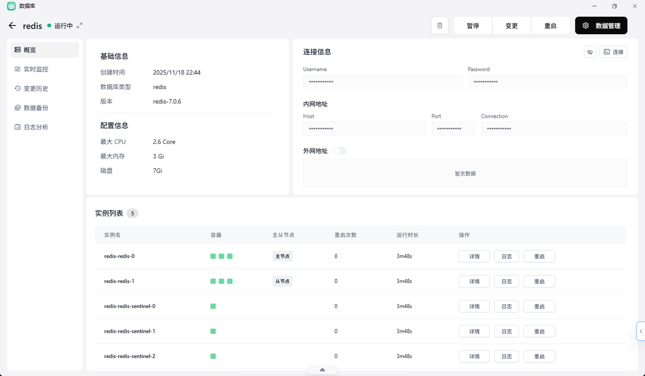 3.第三步:将基础设施"服务化",运维成本降至最低。 我们不再需要招聘专业的 DBA 或 K8s 专家,因为平台内置的应用商店和数据库服务,让我们可以一键部署企业级的高可用集群 。无论是 MySQL、Redis 还是复杂的 AI 应用,都像在手机上装 App 一样简单。备份、恢复、监控、告警等所有繁琐工作都被平台自动处理,团队终于能 100% 专注于业务逻辑。