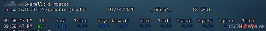 命令描述: 是一款常用的多核CPU性能分析工具,用来实时查询每个CPU的性能指标,以及所有CPU的平均指标