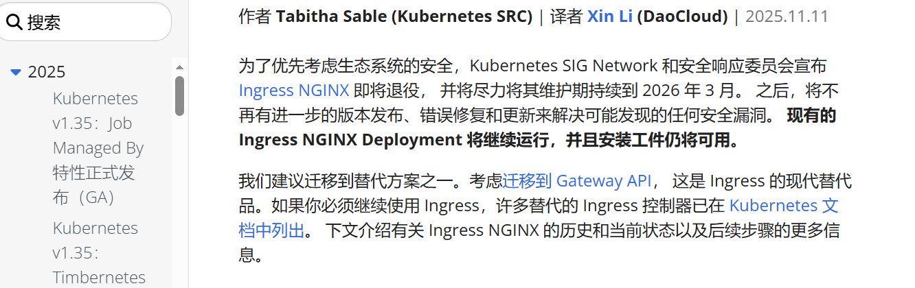 官方公告:Ingress NGINX因安全优先及维护挑战将于2026年3月退役。现有部署仍可用,但不再更新。建议迁移至Gateway API或其他Ingress控制器