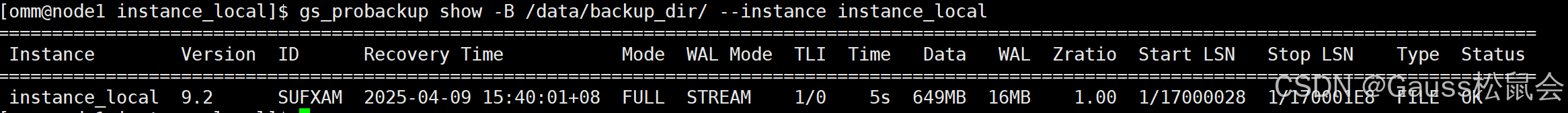 gs_probackup show -B /data/backup_dir/ --instance instance_local