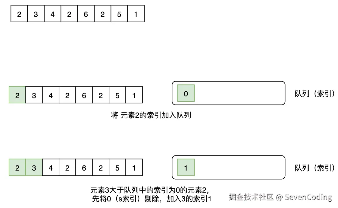 其次,使⽤⼀个双向链表,⾥⾯保存的是索引,遍历每⼀个元素,如果双向队列不为空且最后的元素作为索引的数值⼩于当前的元素,就把当前的元素的索引加到队列的后⾯。(这样可以保证队列从头到尾是单调递减的,也就是队尾的元素就是最⼩的元素)。