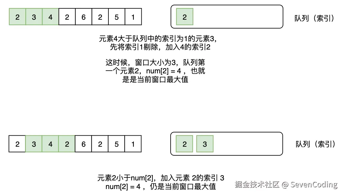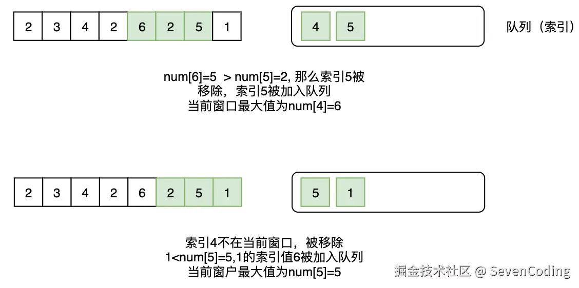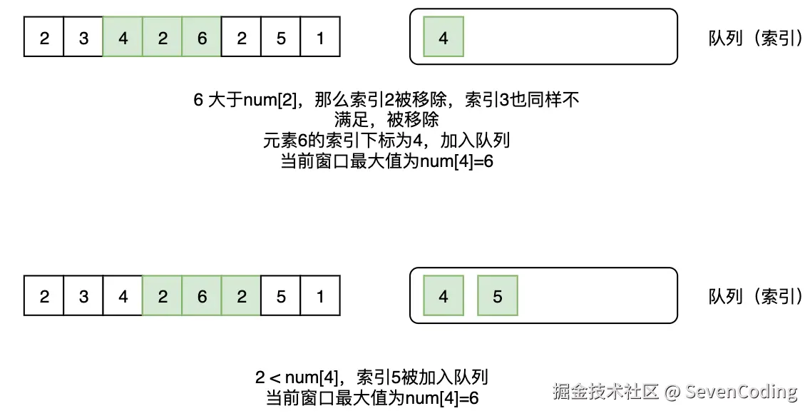 然后把当前的元素加进去队列尾部。判断队列前⾯的元素是不是索引位置不符合,如果不符合,就移除队列头部的元素。