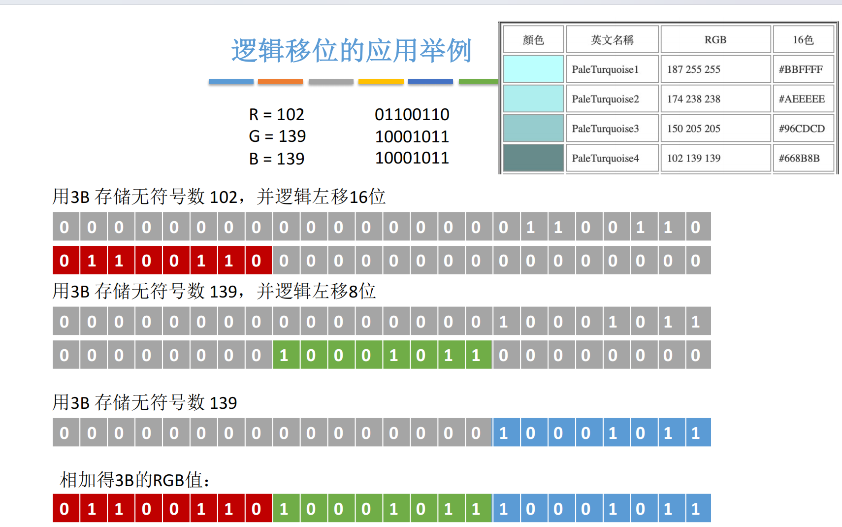 01100110 00000000 00000000 - G = 139 → 逻辑左移 8 位 →