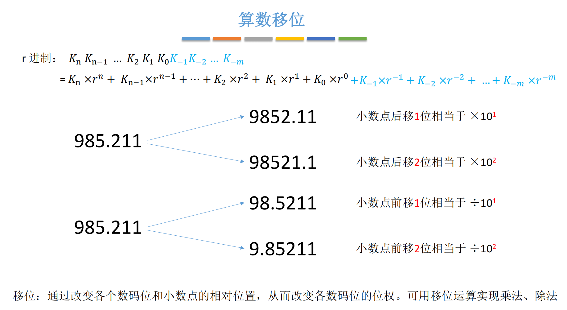 - 右移两位 → 98521.1 ,相当于 ×100 = ×10²
