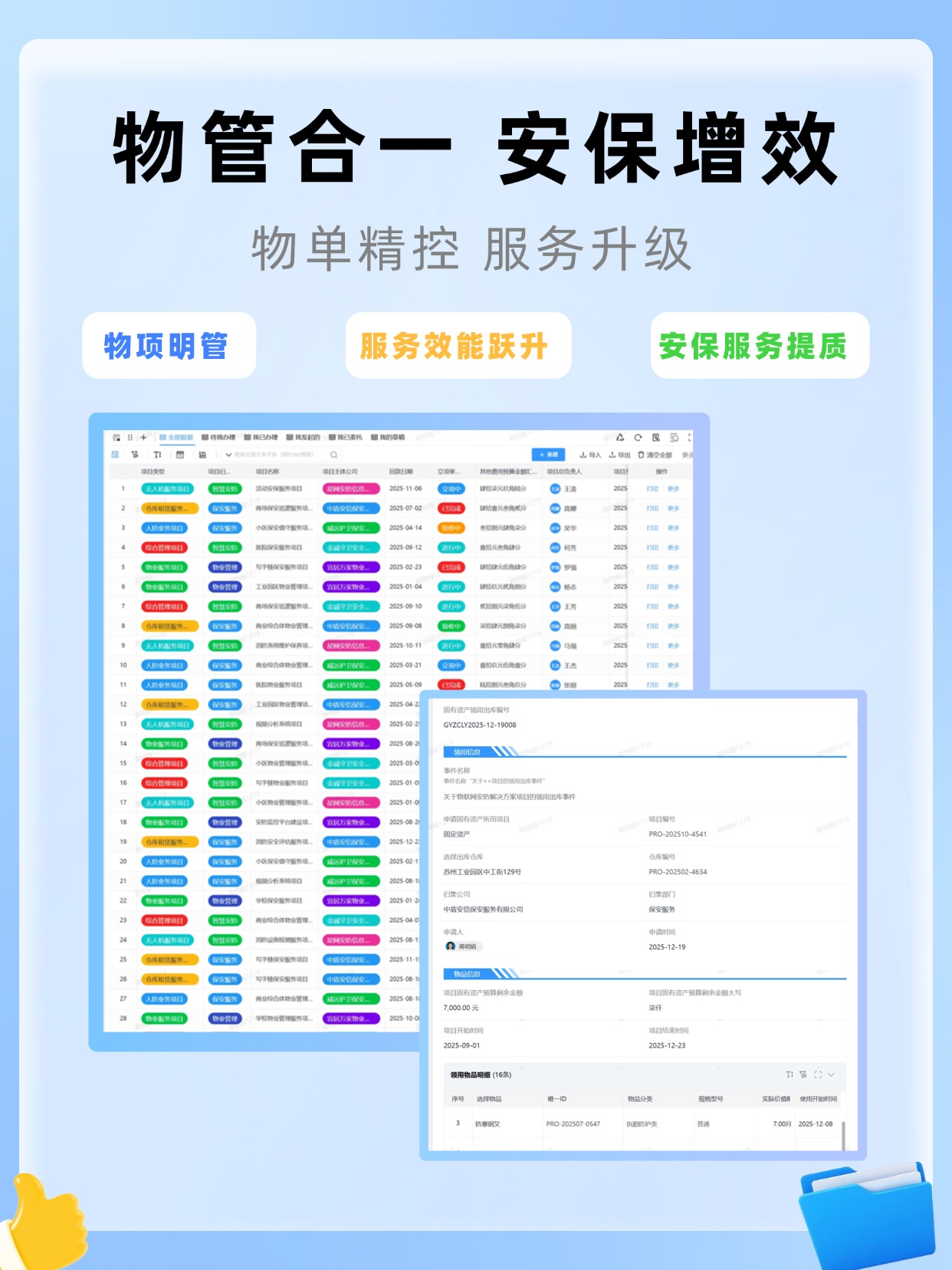**答:**精准匹配安保多网点、多品类物资管控需求!以往台账不同步,易积压或缺料,人工盘点低效。系统按物资类型、网点分类管控,出入库数据自动同步,联动项目需求预判消耗,采购领用更精准,一键导出盘点表,耗时缩短85%,减少内耗、盘活资金。