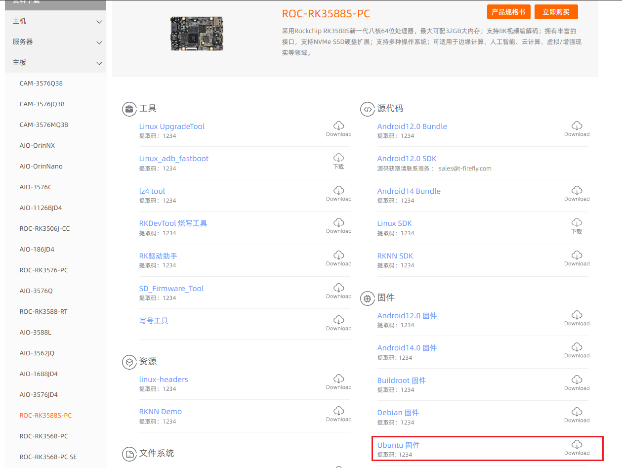 ①:访问https://www.t-firefly.com/doc/download/164.html,选中"固件"的"Ubuntu固件",如下所示