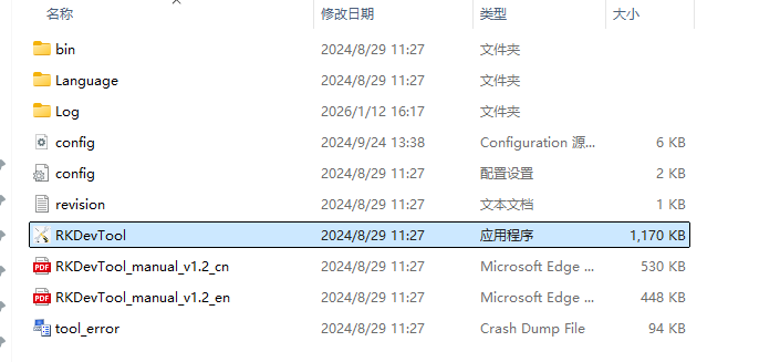 然后打开"RKDevTool烧写工具"解压后的文件夹,找到RKDevTool: