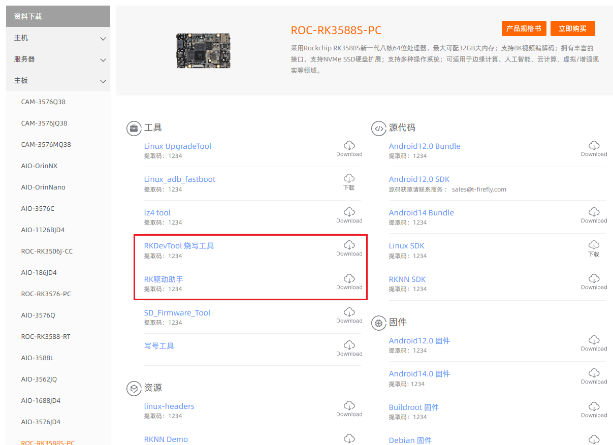 然后可以开始烧录了,首先仍然是在https://www.t-firefly.com/doc/download/164.html下找到RKDevTool烧写工具和RK驱动助手,如下所示: