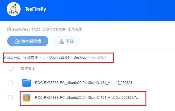 用百度云打开,选择在Ubuntu22.04/SDesktop/kernel-6.1文件节下的ROC-RK3588S-PC_Ubuntu22.04-Xfce-r31161_v1.3.0b_250801.7z压缩包: